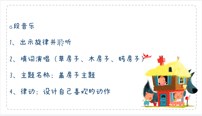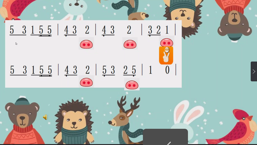 音乐是听觉的艺术,在日常教学中老师要注意引导学生有效聆听。刘畅截取“猪叫声”片段,辨别声音,引出了今日课堂的神秘嘉宾《三只小猪》。在教学中,通过感受歌曲情绪、展开画面联想让学生熟悉主题旋律;随后通过模唱主题旋律、填词演唱、律动创编等多种方式让学生加深了对主题旋律的印象;最后让学生听辨主题旋律在整首乐曲中出现的次数来完成记忆主题旋律的教学目标。