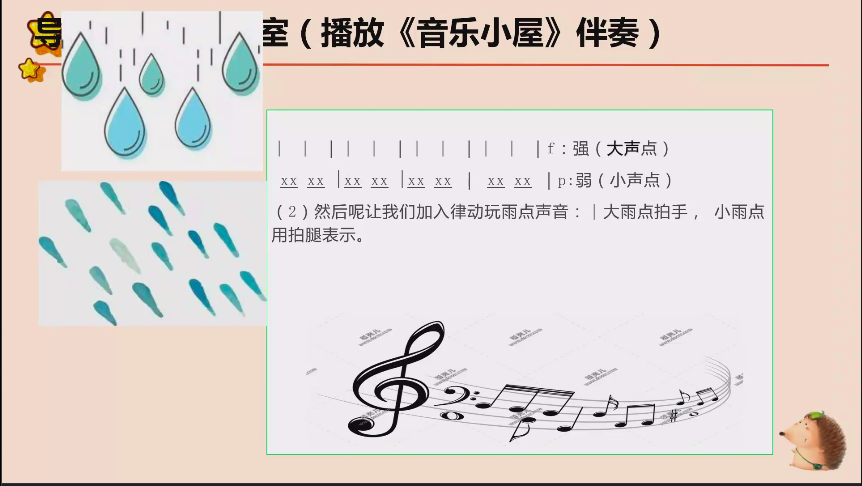金丽涵老师的教学环节以“大雨和小雨”的故事情境导入,通过聆听音乐情绪,歌曲内容让学生感受音乐,通过闯关的模式带领大家一点点去探索《音乐小屋》中的奇妙世界。在教学中,老师通过对比聆听相同乐句,引导学生创编音乐小屋手势动作,感受音乐小屋欢快的氛围,培养学生审美意识。并且利用小组合作唱,或者教师与学生互动唱的过程中认识附点节奏,巩固反复记号。歌曲学唱中,老师引导学生根据图形谱来创编手势动作,把音高低位置变成按门铃的动作,并且让每一位都积极参与其中,调动他们学习的兴趣,并且更加热爱音乐。金老师在愉快的情境中,完成了音乐教学。