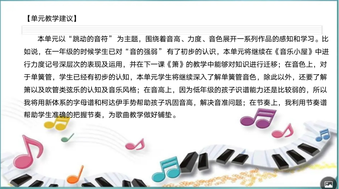 她指出,单元综述时尽量将单元内容以表格或者思维导图的形式,更加直观、简明地呈现本单元所要掌握的知识内容,内容简析则可结合教材编写意图与老师对音乐的理解来分析;学习评价要有更显性的评价目标和评价内容,如歌唱教学,可针对学习成果、歌唱习惯以及指向音乐素养等来制定。此外还要认真学习新修订的课标内容,科学合理地进行单元整合。