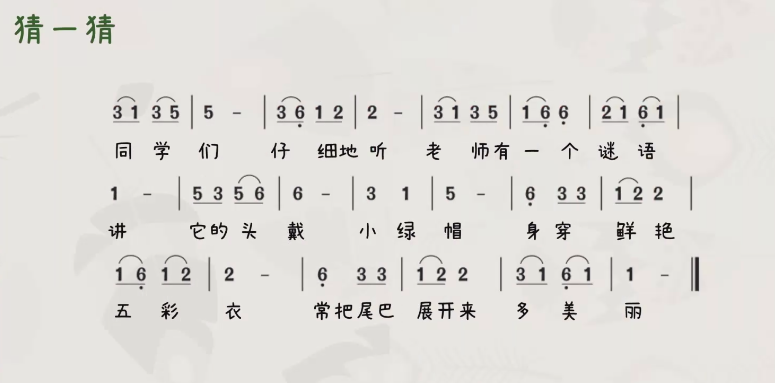 郑甜甜老师先声夺人,用旋律填词演唱猜谜的形式导入课题《金孔雀轻轻跳》,以优美的歌喉快速抓住了大家的课堂注意力。通过介绍傣族的风土人情,学习傣族的舞蹈动作,让学生学习歌曲的同时感受傣族的音乐风格。在教学中,老师将节奏与傣族舞蹈动作结合,带领学生进行律动,并在拓展环节欣赏孔雀舞,引导学生自行创编舞蹈,提高学生的参与度与参与音乐课堂的积极性。学唱过程中,老师运用师生合作演唱简谱,结合柯尔文手势,以及画旋律线,帮助学生更好地唱准音高。本节课中,郑老师对学生们的要求循序渐进,着重培养学生的聆听与演唱习惯,提高学生的学习积极性。整堂课由浅入深,稳打稳扎,展现了郑老师个人夯实的音乐素养。