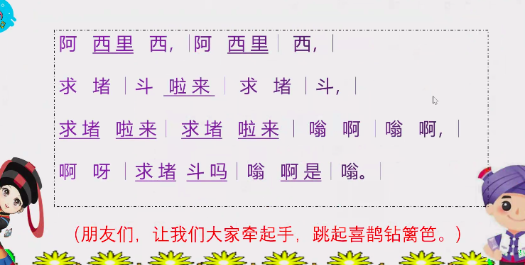 吴宁宁老师抓住二年级学生的心理特点,通过歌曲“阿西里西,阿西里西”打招呼问好的方式,大大激发了学生学习歌曲《喜鹊钻篱笆》的兴趣。在教学中,老师通过欣赏视频感受彝族风土人情,通过聆听歌曲,学习彝族简单舞步动作,感受歌曲情绪,培养学生审美意识。利用师生接龙的方式朗读歌词、学唱歌词,通过隐藏歌词帮助学生不断记忆歌曲,最后在游戏“喜鹊钻篱笆”中,带领学生手拿串铃跳彝族舞步,一起边唱边跳边玩,让学生在玩中学,体现了愉悦性,激发学生对少数民族音乐的热爱之情。