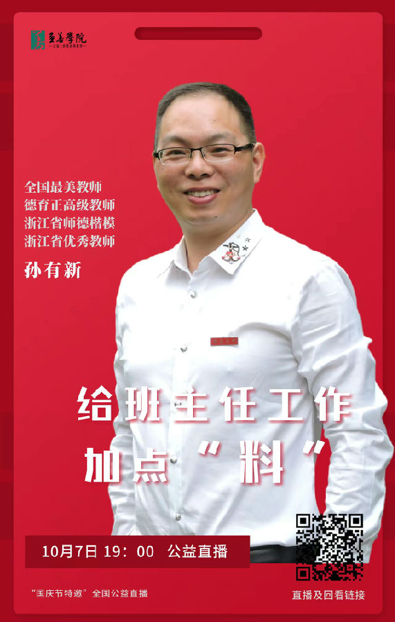 四.主讲人:孙有新老师,浙江师范大学附属瑞安高级中学(瑞安市第五中学)班主任、思想政治教师,德育正高级教师,浙江省首批中小学班主任工作室领衔人,曾获全国十佳好老师、全国最美老师、大国良师创新奖、浙江省师德楷模、浙江省优秀教师、新时代浙江省“万名好党员”、温州市名班主任、2023年温州市班主任年度人物等荣誉称号,2014年浙江省中小学班主任基本功大赛高中组第一名。