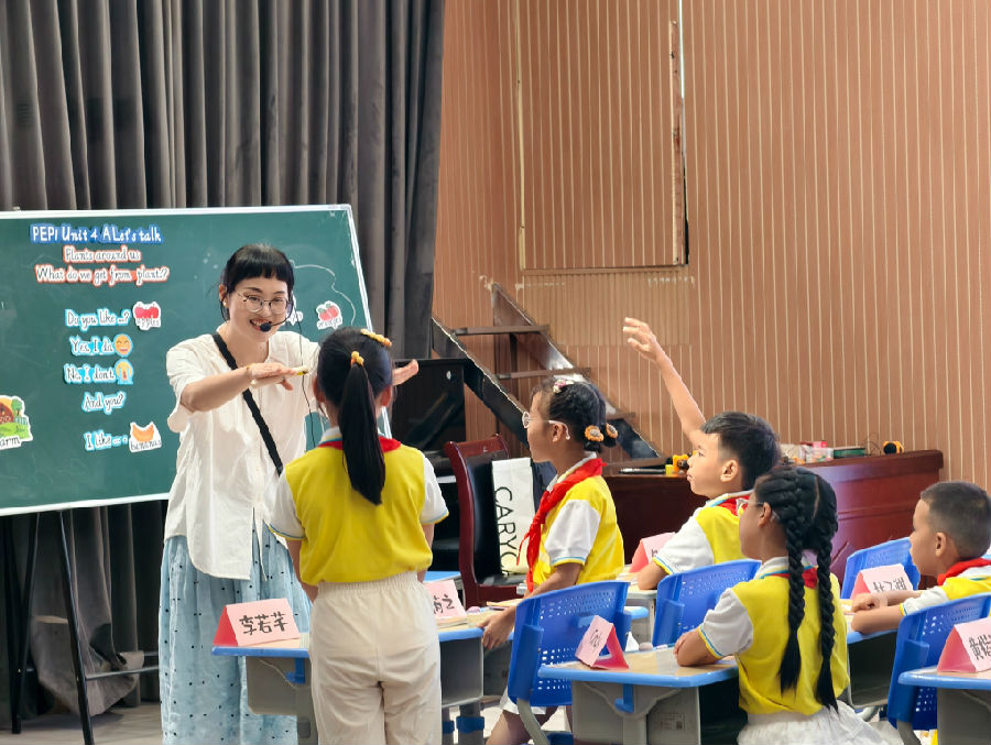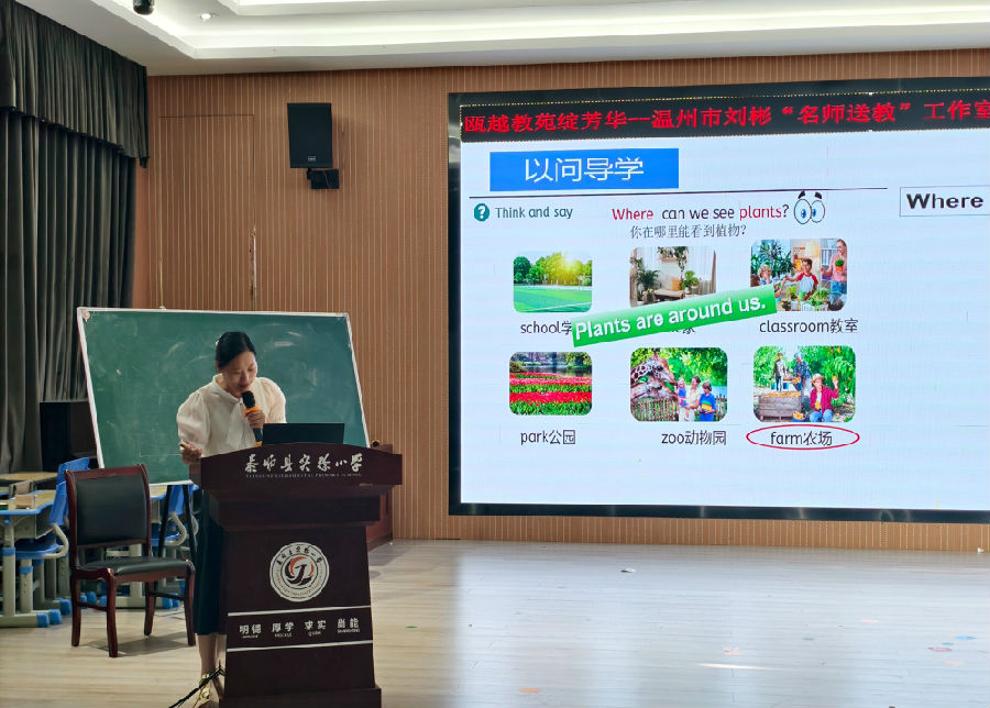 平阳县昆阳镇实验小学梅蕾老师带来展示课《PEP1 Unit4 A Let’s talk》。课堂以“happy farm”为核心情境,以“be a good volunteer”为驱动任务,设计“know the plants”“work with plants”“show the plants”项目化活动,引导学生沉浸式学习。梅老师围绕主题“What do we get from plants?”,设计视听、读图等多元任务,既帮助学生学习新知,又培养思维能力;同时巧妙运用AI技术,让课堂更具活力与创新性,为参会教师呈现了高质量的示范课例。